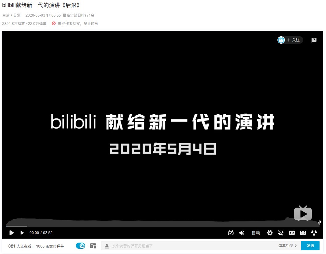 5月4日青年節(jié),B站聯(lián)合央視新聞、光明日報、中國青年報、環(huán)球時報、新京報、澎湃新聞、觀察者網(wǎng),發(fā)布了一則獻給新一代的青年宣言片《后浪》。國家一級演員何冰傾情獻聲,畫面搭配年輕人的青春影像混剪,認(rèn)可、贊美了年輕一代。截止5月12日,《后浪》在B站的播放量已經(jīng)達(dá)到2351萬。