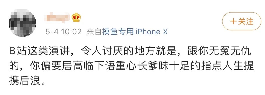 為什么對年輕人一頓猛夸的《后浪》反而引來年輕人的吐槽?不真誠。比如演講中的那句:“弱小的人才習(xí)慣嘲諷和否定”,后浪們認(rèn)為整個短片中透露出的這種定義、訓(xùn)導(dǎo)式的強行說教和濃重的雞湯味讓人反感。