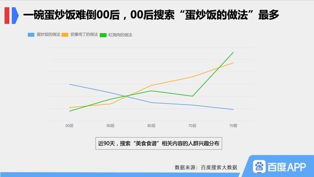 除了詩和遠(yuǎn)方,后浪們也是有著普通生活的年輕人,會為了“今天吃什么”這種問題犯難。百度搜索大數(shù)據(jù)顯示,疫情期間年輕人經(jīng)常上網(wǎng)搜索各類食譜,而00后對蛋炒飯的喜愛程度超過了宮保雞丁、紅燒肉。