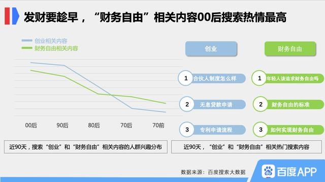 而一場疫情不僅解鎖了年輕一代的生活技能,也給他們敲響了財務(wù)意識的警鐘,在搜索大數(shù)據(jù)報告中,對于創(chuàng)業(yè)和財務(wù)自由,00后、90后表現(xiàn)出更高的搜索積極性,"合伙人制度怎么樣""無息貸款怎么申請""專利申請流程"等內(nèi)容成為00后搜索創(chuàng)業(yè)相關(guān)內(nèi)容時的熱門內(nèi)容。