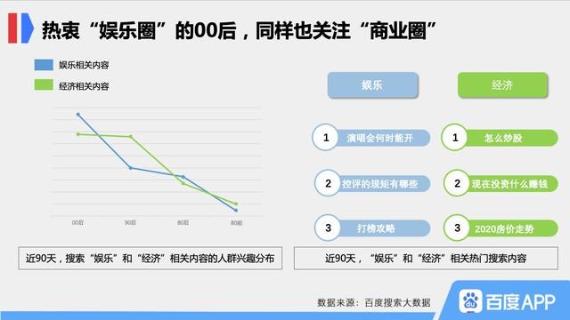 對"怎么炒股""現(xiàn)在投資什么賺錢""2020房價走勢"等經(jīng)濟內(nèi)容,年輕人們也有著熱切的關(guān)注,特別是00后,對于"娛樂"和"經(jīng)濟"的搜索積極性一騎絕塵,更是體現(xiàn)出這一代新青年身上的多元化。