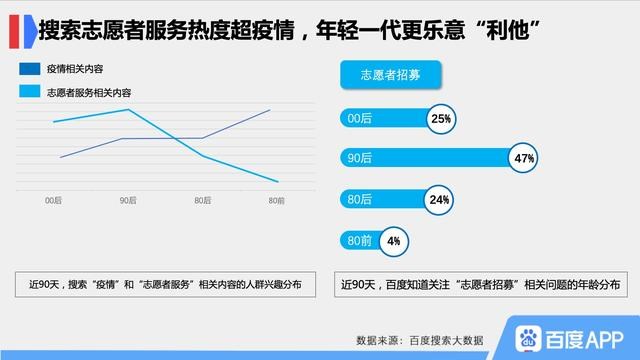 除了過好眼下自己的生活,這屆年輕人也胸懷家國天下。百度搜索大數(shù)據(jù)顯示,近90天,90后對“志愿者服務(wù)”的搜索熱度最高,00后次之;同樣的,從百度知道關(guān)注“志愿者招募”相關(guān)問題的年齡分布來看,90后占比47%,幾乎占據(jù)半壁江山,00后占比25%,排名次席。