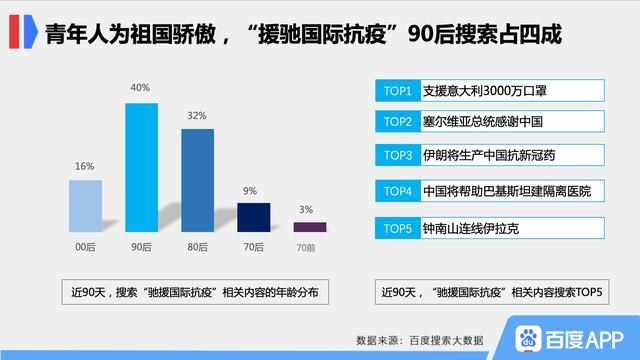 近90天,90后搜索“馳援國際抗疫”占比達(dá)40%,遠(yuǎn)高于其他年齡段人群。