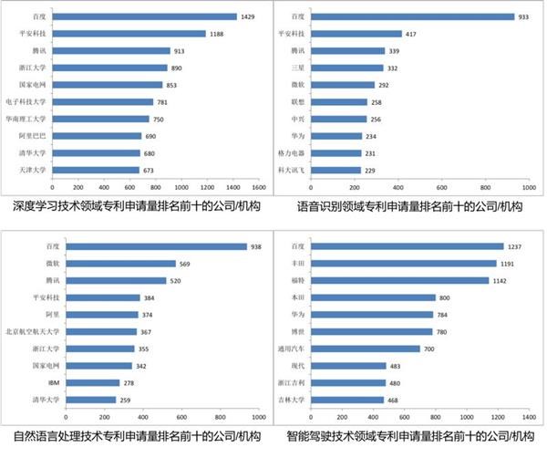 在語音識別和自然語言處理兩大領域,百度以933件和938件的專利申請量在排名榜中遙遙領先;