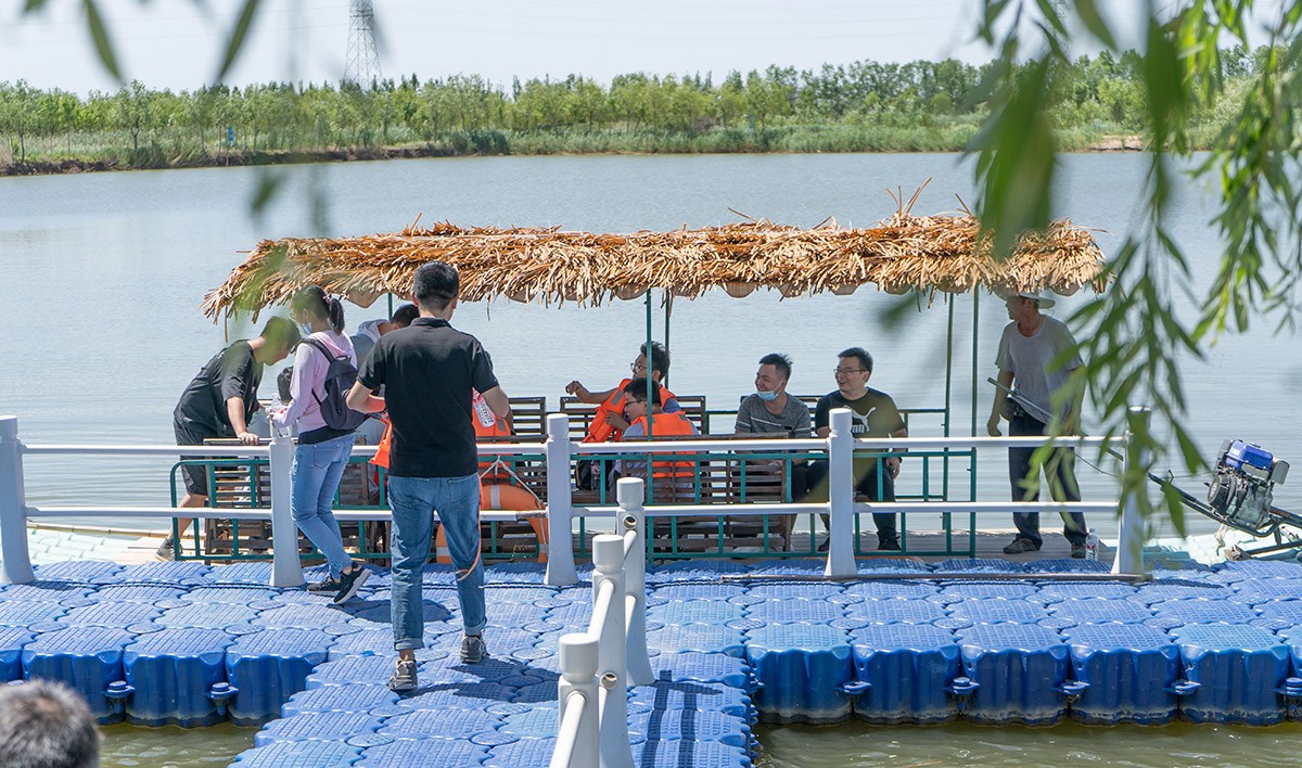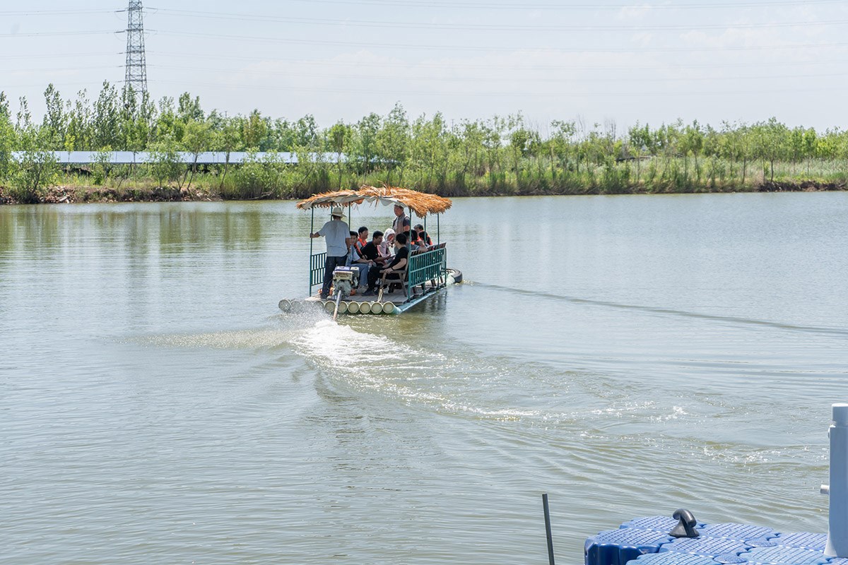 幾人一組乘坐小艇前往湖中央,