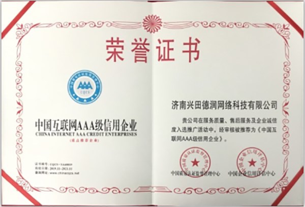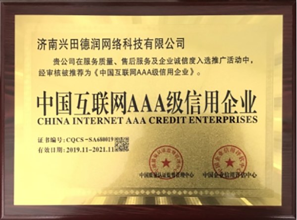 近日,興田科技憑借在互聯(lián)網(wǎng)領(lǐng)域深耕七年的技術(shù)經(jīng)驗優(yōu)勢、優(yōu)質(zhì)的服務(wù)水平和完善的售后體系,在合作客戶中享有極高的企業(yè)信譽度和美譽度,被中國質(zhì)量認證監(jiān)督管理中心、中國企業(yè)信用評估中心評選為中國互聯(lián)網(wǎng)AAA級信用企業(yè)。