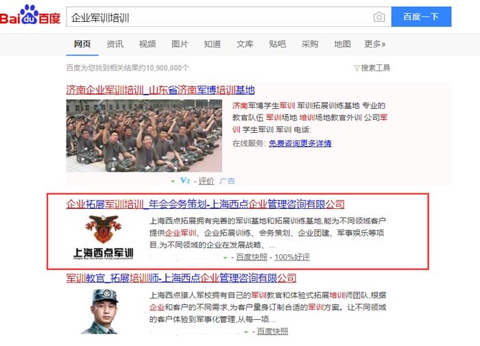 上海西點(diǎn)軍訓(xùn)機(jī)構(gòu)與興田科技合作之后,網(wǎng)站排名提升很快,涉及軍訓(xùn)類的關(guān)鍵詞首頁排名已上千個(gè),給網(wǎng)站帶來了很大流量,提升效果非常好。其中首頁排名第1位的關(guān)鍵詞也有很多,興田科技專注SEO優(yōu)化,7天快速提升網(wǎng)站在百度中的排名。